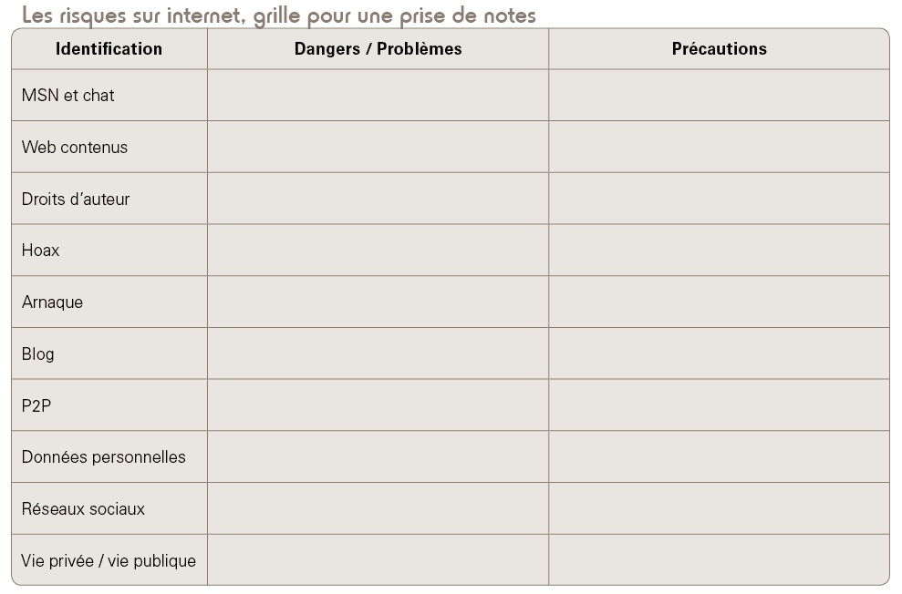 Plutôt que de dispenser quelques heures tout au long de l'année, décision est prise de programmer une séance de trois heures dont les différentes étapes auront pour objectif de modifier les comportements des élèves en leur apportant des connaissances précises. Dans le but de se former elles-mêmes et de découvrir la formation Internet et citoyenneté 2 qui vient tout juste d'être conçue, les deux enseignantes font venir le formateur du Centre départemental de documentation pédagogique. Pour cette première fois, celui-ci intervient devant un public non choisi, puisqu'il s'agit des élèves alors en permanence. L'intérêt de ces derniers est mitigé et confirme la nécessité d'organiser un véritable temps de formation et de réflexion sur les usages d'internet, si l'on veut que les élèves s'impliquent dans cet apprentissage. Après son passage dans les établissements, le formateur laisse volontiers son diaporama, et c'est donc à partir de celui-ci que la séance se construit. Deux classes de troisième sont réunies un après-midi, et dans un premier temps, chacun reçoit une grille (voir annexe) à compléter au fur et à mesure des documents présentés. Malgré la réaction des élèves qui ironisent un peu parce qu'ils savent ce qu'est un hoax ou le P2P, la projection d'extraits du diaporama les intéresse, car il est accessible et leur parle de choses familières. Ainsi, collectivement, ils font le point sur les différents risques liés à l'usage de l'internet. Puis, les enseignantes distribuent un article "Marc L. genèse d'un buzz médiatique", paru en mars2009, dans le numéro30 de la revue Le Tigre 3. Le document brosse le portrait d'un individu que le journaliste ne connaît pas, mais dont il a pu reconstituer la vie grâce à toutes les informations laissées sur internet. Surligneur à la main, les élèves repèrent l'ensemble des sites qui ont été utilisés par le journaliste. La discussion s'engage très aisément entre tous, car cette enquête bien réelle est exemplaire pour démontrer que les empreintes numériques que chacun dépose n'ont rien de virtuel !