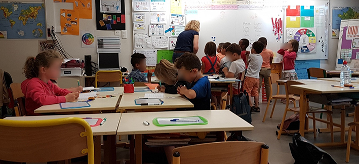 Visite de l’école élémentaire À la suite de ce travail, les élèves vont aller découvrir l’école élémentaire. Mais avant de quitter la classe de CP, il faut tout remettre en place : "Au CP, on range sa chaise sous son bureau !" demande l’enseignante. La visite de l’école élémentaire offre à l’enseignante l’opportunité de donner quelques informations sur le fonctionnement différent de l’école élémentaire : "Quand on vient au CP, on vient tout seul, sans papa maman". Mais cette différence est rapidement gommée par l’observation des portemanteaux décorés des CP : "À la rentrée, vous mettrez les jolies étiquettes que vous avez coloriées tout à l’heure." S’ensuit la découverte des classes, de l’entrée de l’école et du bureau du directeur, Monsieur Gaubert. Ce dernier accueille les élèves et leur donne quelques informations. Enfin, les élèves découvrent la cour de récréation avant de retourner dans leur classe pour un bilan de cette riche aventure. Journée d’accueil pour les familles : En prolongement, dans la même semaine est proposée une journée d’accueil pour les familles de GS, afin de répondre à leurs questions et de rassurer aussi les parents sur une continuité co-construite entre GS et CP. Lorsque cela est possible, les parents assistent à l’acheminement de la valise jusqu’à la classe de CP et peuvent ainsi prolonger à la maison cette grande réflexion qui vise à lisser les ruptures entre la maternelle et l’entrée au CP.