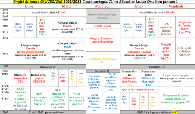 Voici un exemple d’emploi du temps, qui a évolué au fil du temps, mais permet de mieux comprendre le fonctionnement des groupes. Le lundi, durant le premier temps, 3 groupes sont créés, les CE1 et CE2 travaillent avec les enseignants, par niveau, tandis que les CM1 sont en autonomie totale pour un Plan de Travail en français, mathématiques ou histoire géographie. Les élèves poursuivent avec le français, en 2 groupes dirigés : les CE2 peuvent alors intégrer le cours avec les CM ou les CE1 selon leurs besoins et difficultés et "basculer” d’un groupe à l’autre. Les enseignants pourront ainsi privilégier l’oral, par exemple, pour les plus faibles. Les groupes évoluent constamment selon les acquisitions des élèves. Pour cela, les enseignants échangent par mail, oralement ou via un journal de bord pour reporter la progression de l’élève ou ses difficultés.