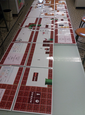 Répartition de la classe en 8 groupes de niveau (non précisé aux élèves) en fonction des résultats de l'évaluation précédente non rendue (sur le thème du pain). Chaque groupe doit s'intéresser à une des quatre hypothèses formulées collectivement après le diaporama. Découverte du matériel : • Grand plateau de jeu plastifié, • pion Mario pour avancer. Les élèves recopient les éléments trouvés en groupe dans leur cahier au fur et mesure du jeu (trace écrite). | Plateau de jeu pour chaque groupe : | |
