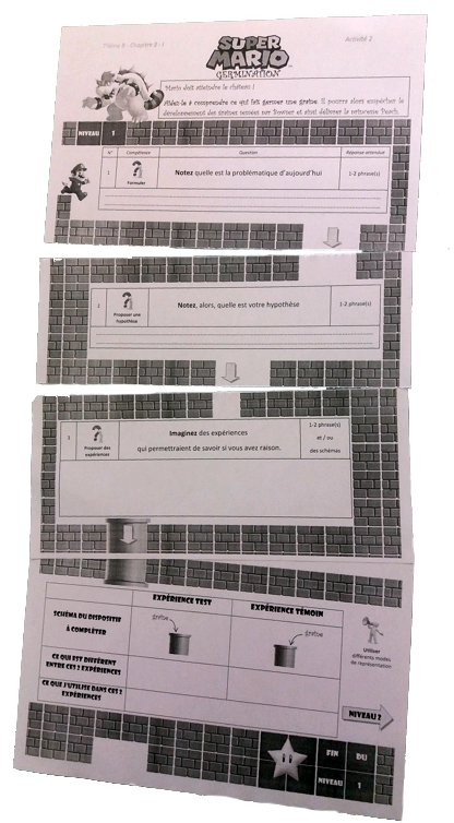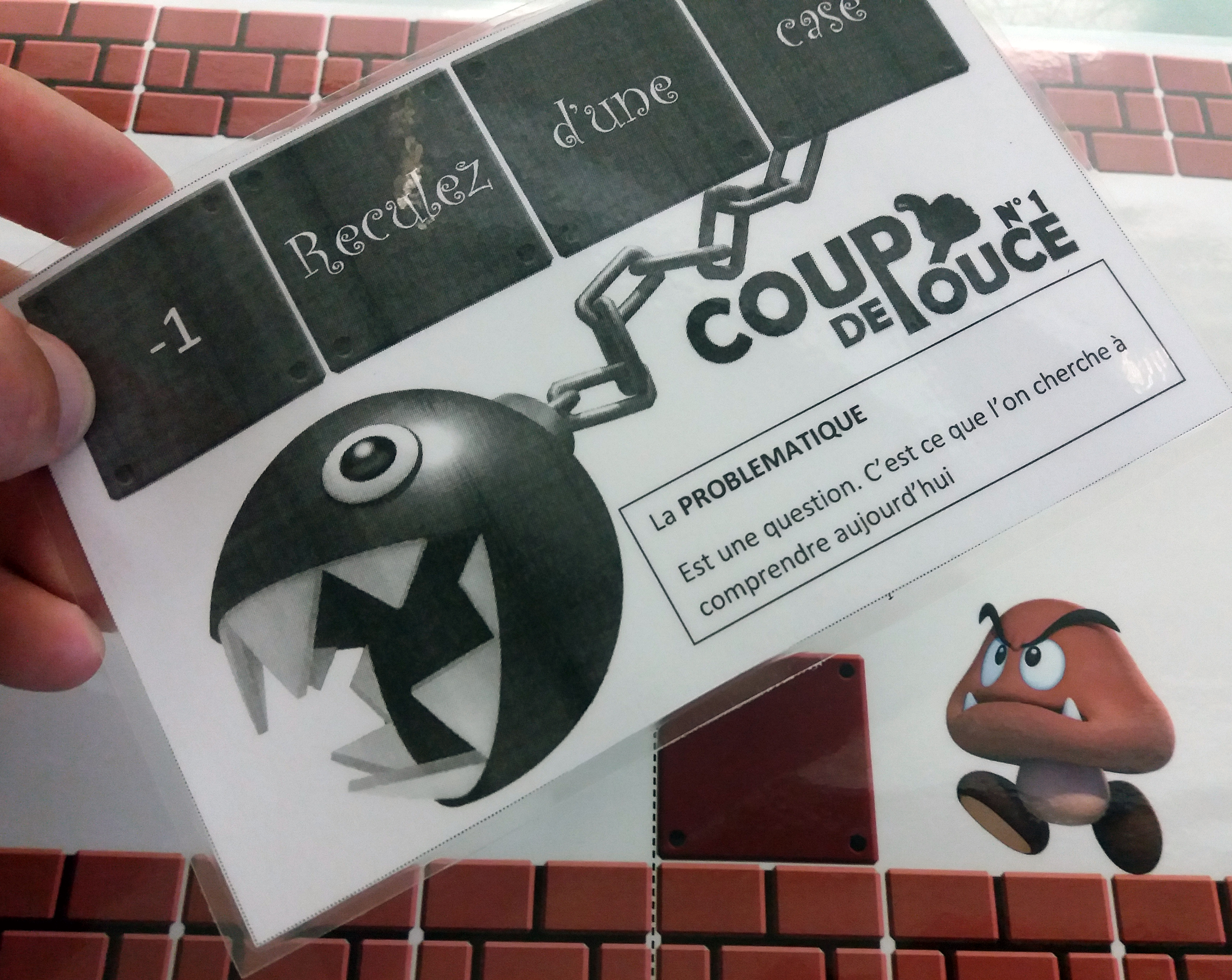 La séance jeu de plateau (1 h 30) | Un diaporama de lancement qui reprend les codes visuels et sonores, les symboles et les personnages du jeu Super Mario (Mario, Bowser, Princesse Peach) sorti en 1985 par Nintendo. À la fin du diaporama : situation problème 15 min environ (avec les hypothèses) | Situation problème à résoudre par les 8 groupes : "La princesse Peach est enfermée dans sa tour autour de laquelle pousse des plantes carnivores. Comment va faire Mario pour supprimer les plantes et la délivrer ?" Cf. Parallèle avec les power-ups de Mario dans le jeu Super Mario qui lui donnent des capacités spéciales comme lancer des boules de feu par exemple. |