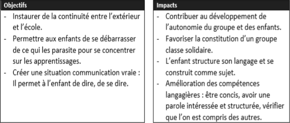 Le quoi de neuf : une transition entre l’intérieur et l’extérieur Au collège, est utilisé Le “quoi de neuf ?” comme un temps d'expression libre de l’élève, au début du cours ou lors d'une séance spécifique, qui lui permet de parler d'un sujet de son choix à partir ou pas d'un objet qu'il a apporté.