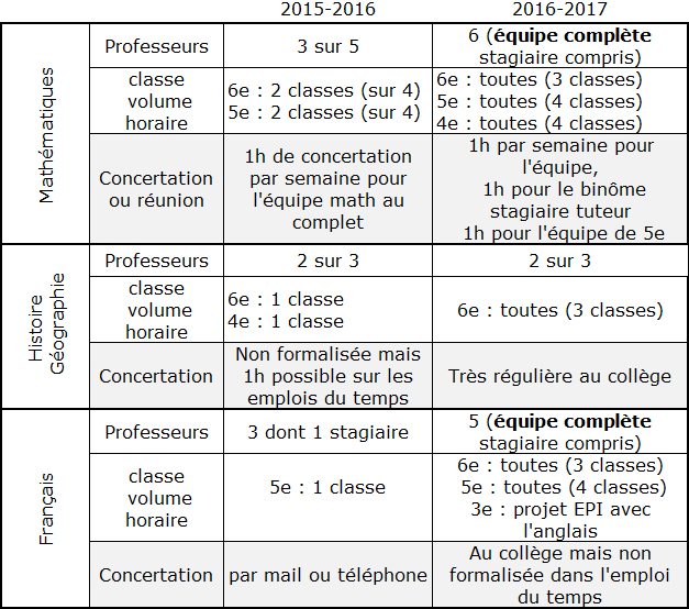 Tableau récapitulant l’évolution du co-enseignement dans le collège.