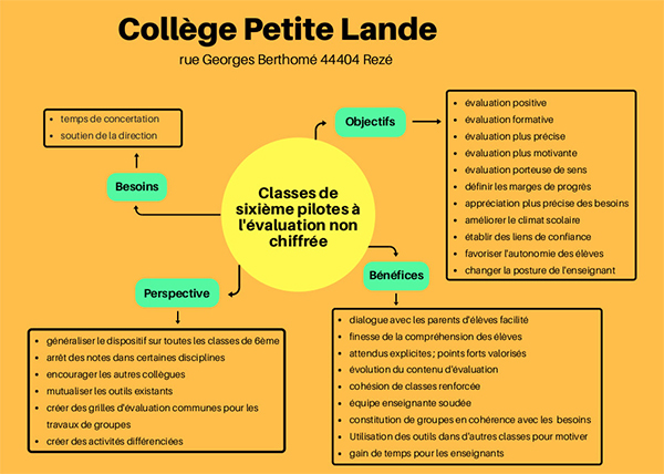 La communication auprès des parents d’élèves se fait par un bulletin trimestriel. Dans un premier temps, pour communiquer sur les acquis à travers le code couleurs choisi, l’équipe a choisi d'élaborer un bulletin spécifique aux classes sans note, il se présente en deux parties :