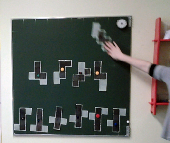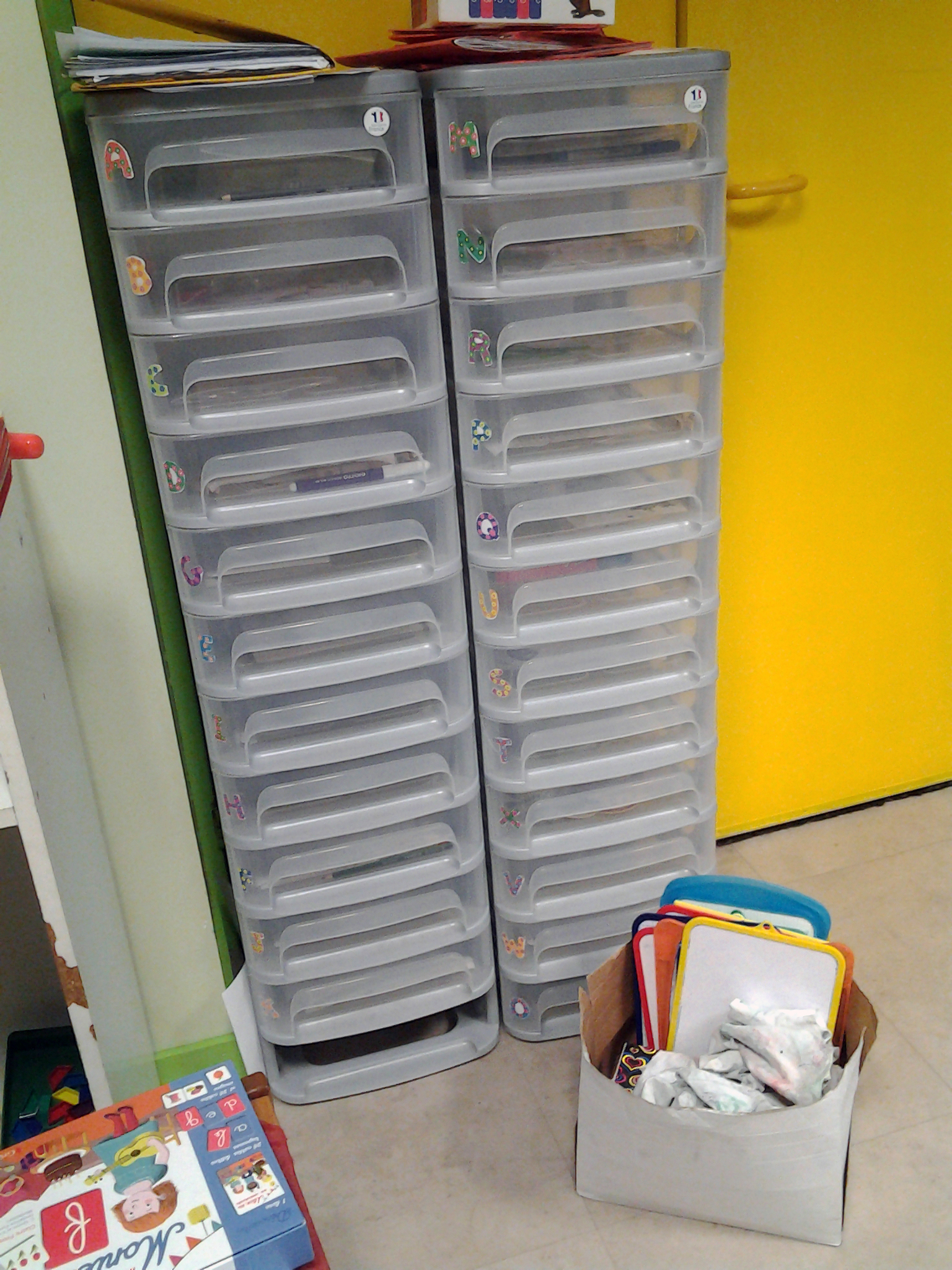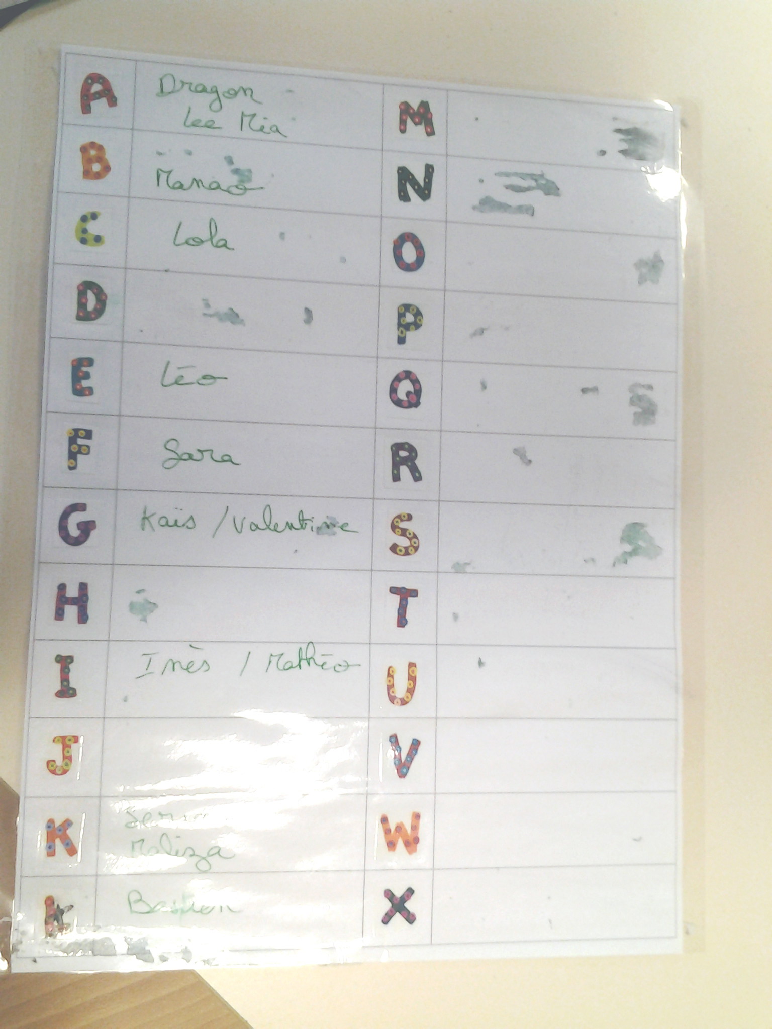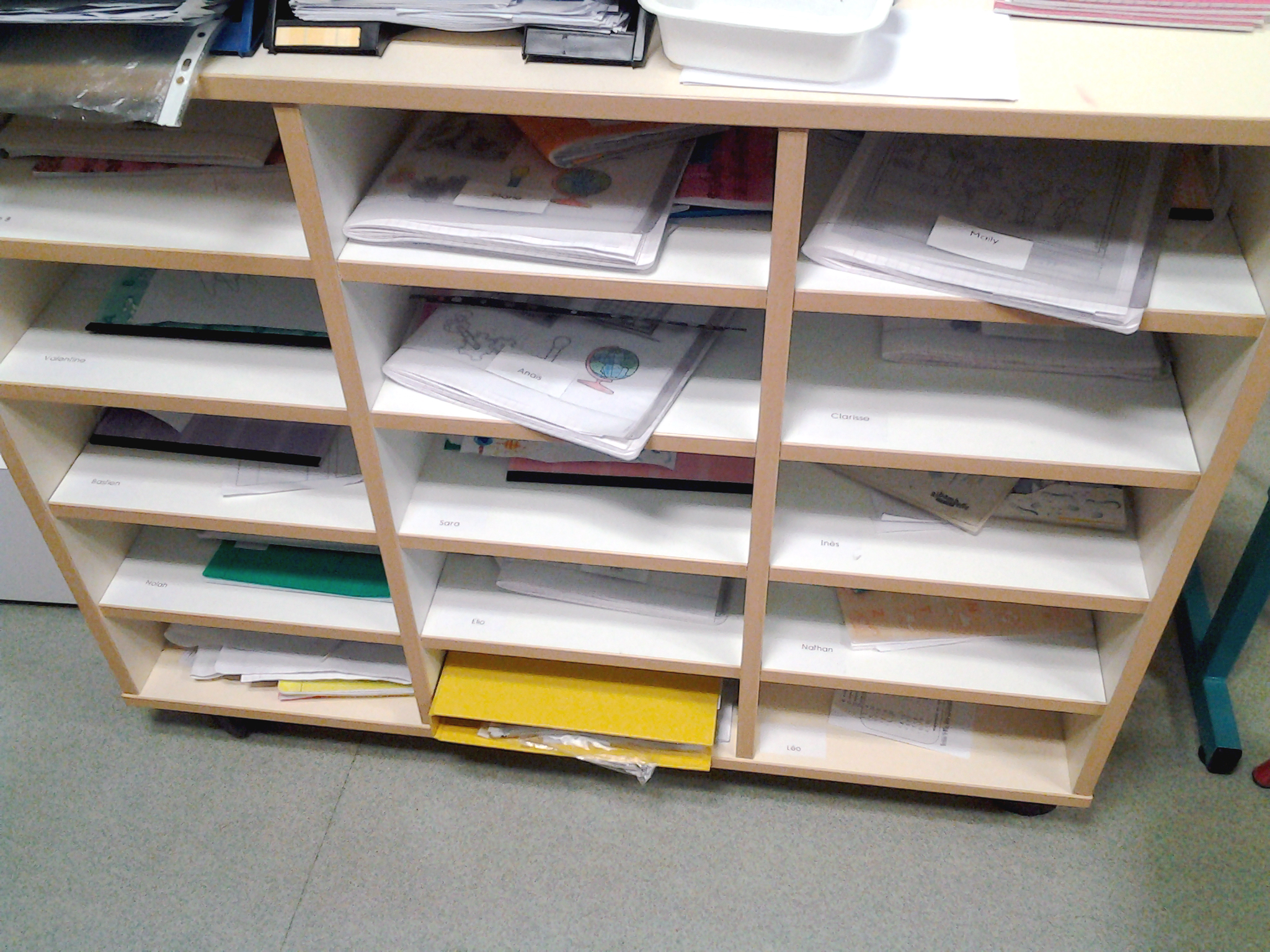 Certaines activités notamment celles qui nécessitent une manipulation (étiquettes, de carte, …) sont réalisées lors d’atelier, les enfants pouvant les réaliser seuls ou en groupe. Elles sont stockées dans des tiroirs, les enfants consultent l’affiche (tous les jours) pour savoir ce qu’ils doivent faire. Les activités stockées dans les tiroirs sont régulièrement changées en fonction de l’avancée des enfants dans leurs apprentissages. C’est l’enseignante qui a complété les tiroirs qui réalise la répartition (en fonction du niveau des élèves) tous les matins avant que les enfants n’arrivent. La conception du meuble a été pensée et réalisée par les deux enseignantes. Chaque tiroir est repéré par une lettre, la feuille de consignes est plastifiée pour être réutilisée.