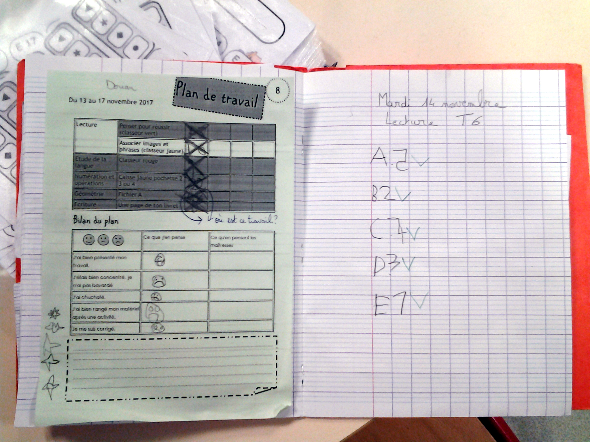 Le fonctionnement expliqué par un élève. La maîtresse a écrit sur son cahier la date d’aujourd’hui, ainsi qu’orthographe 5. L’élève va, tout seul, chercher le classeur. Il sait où le trouver, car sur les murs, sont disposées des grilles qu’il peut consulter aussi souvent qu’il veut. Il corrige immédiatement son travail grâce aux corrigés situés en fin de classeur. Certaines fiches sont plastifiées afin d’être effacées après leur utilisation, d’autres sont en nombres suffisants pour que chaque élève ait la sienne et puisse la coller dans son cahier.