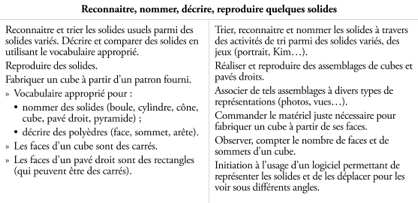 En géométrie, il est indiqué que “La connaissance des solides se développe à travers des activités de tri, d’assemblages et de fabrications d’objets. Les notions de géométrie plane et les connaissances sur les figures usuelles s’acquièrent à partir de résolution de problèmes (reproduction de figures, activités de tri et de classement, description de figures, reconnaissance de figures à partir de leur description, tracés en suivant un programme de construction simple)”.