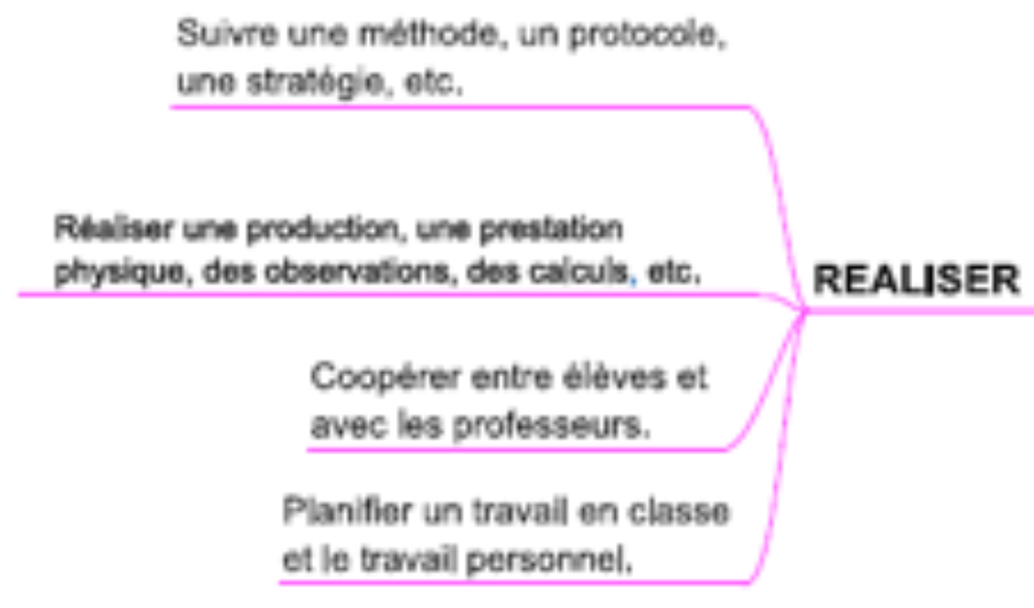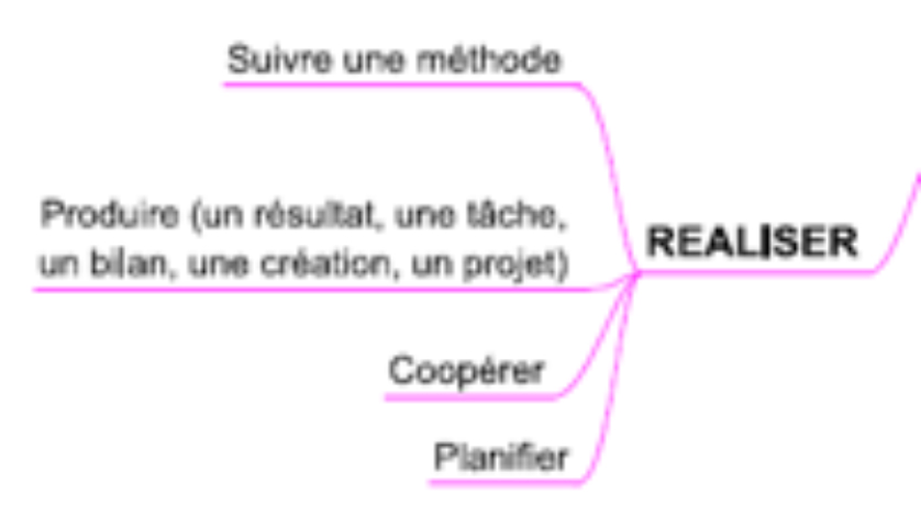 Les cinq branches principales présentent les compétences définies par des verbes : communiquer, réaliser, s’informer, raisonner et connaître. Chaque verbe est ensuite décliné en sous-compétences.