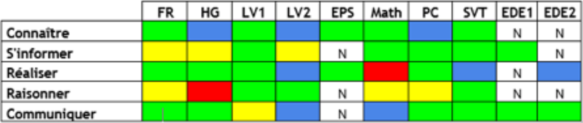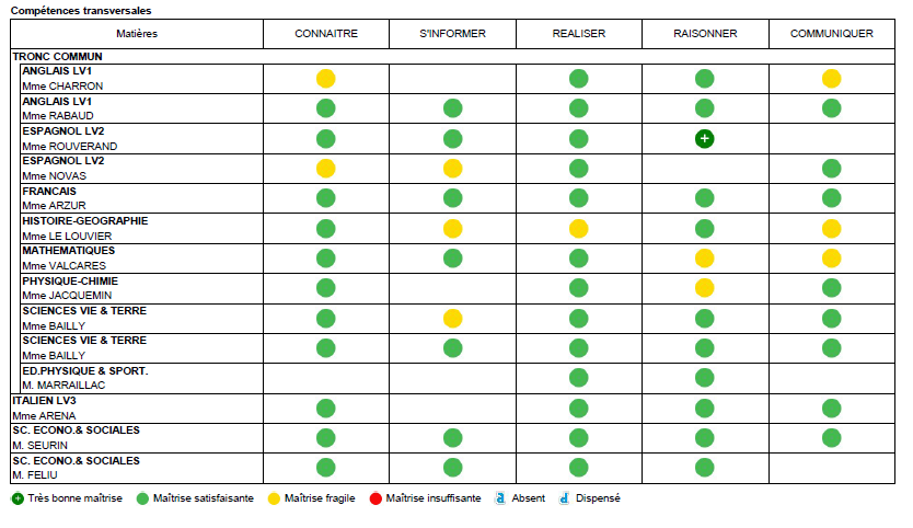 À compter de la rentrée 2018 et après avoir fonctionné grâce à un compte excel sur gmail, les enseignantsont opté pour un bulletin réalisé sous pronote qui garde l'architecture précédente. Ce passage à pronote entraîne un bulletin un peu moins visuel (des pastilles plutôt que des cases remplies) mais permet par contre une gestion plus facile des fichiers élèves (arrivée de nouveaux élèves...) et une saisie déportée sécurisée.
