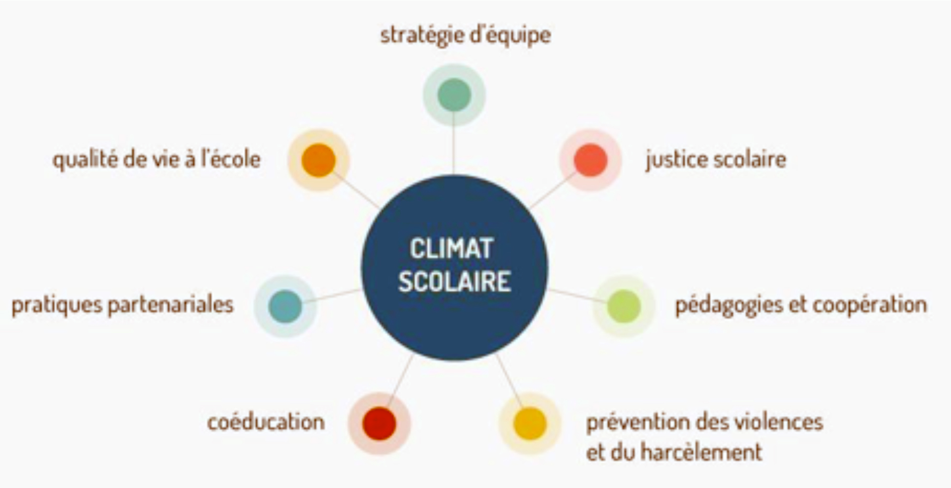 À travers ces pistes, on retrouve des axes de “l’approche systémique” pour améliorer le climat scolaire :