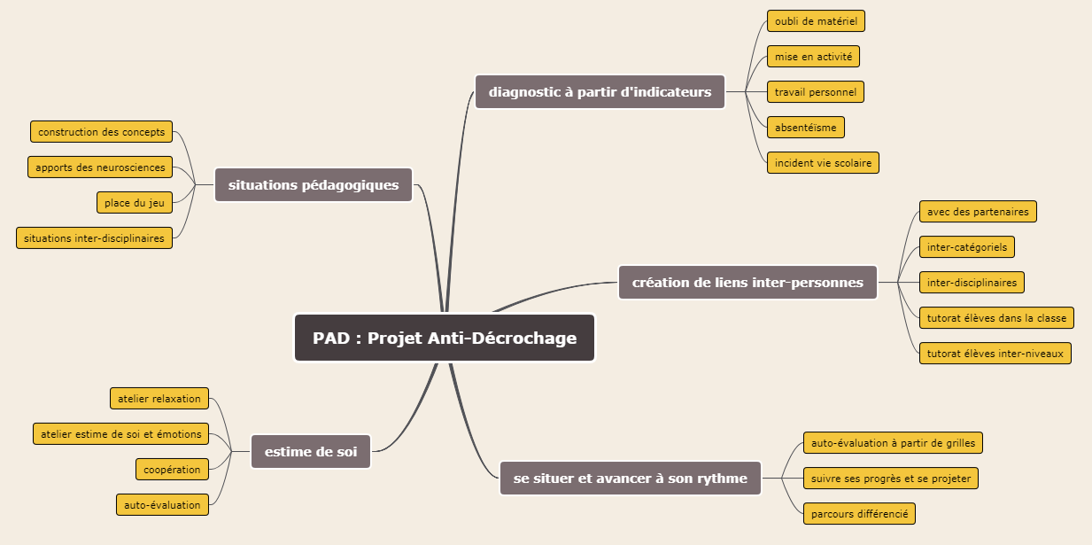 • des situations d’apprentissages favorisant la motivation et le décloisonnement disciplinaire, • des actions au sein de collège mises en place par des personnes inter-catégorielles pour faciliter le lien et le suivi de l’élève dans sa globalité, • des actions pour aider l’aider l’élève à développer son estime de soi et à lui donner envie d’apprendre.