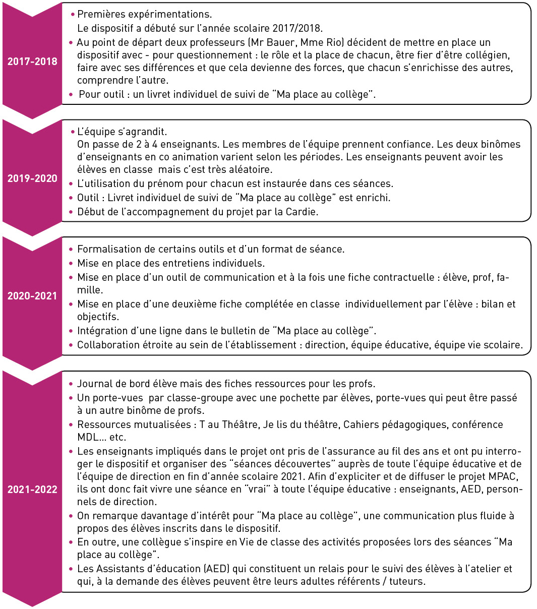 L’équipe enseignante constate des “inscriptions volontaires” en plus grand nombre au fil des anset aussi suite à la “séance découverte de MPCA”. En effet, cette séance devient une séance “diagnostique” pour les enseignants qui confirme la nécessité pour certains élèves de participer aux ateliers. Des entretiens individuelssont organisés ensuite et qui permettent à l’élève de s’interroger sur les enjeux de l’apprentissage, de poser les objectifs et de contractualiser son inscription dans le dispositif : il y a toujours possibilité de refuser la proposition de participation à “Ma place au collège” même s’il y a très peu de refus suite aux séances découvertes et aux entretiens individuels. Il y a une sorte d’accord tacite.