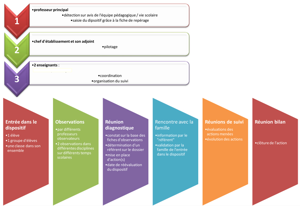 OrganisationLe dispositif se fait sur cinq temps : le repérage, l’observation en classe, la réunion diagnostique de l’équipe, la proposition de remédiation à l’élève et le bilan. Un suivi est assuré par des professeurs volontaires (les coordonnateurs). Leur rôle consiste à veiller au bon déroulement des temps de réunions, au suivi des actions engagées et au respect des temps de bilan en équipe à intervalles réguliers.