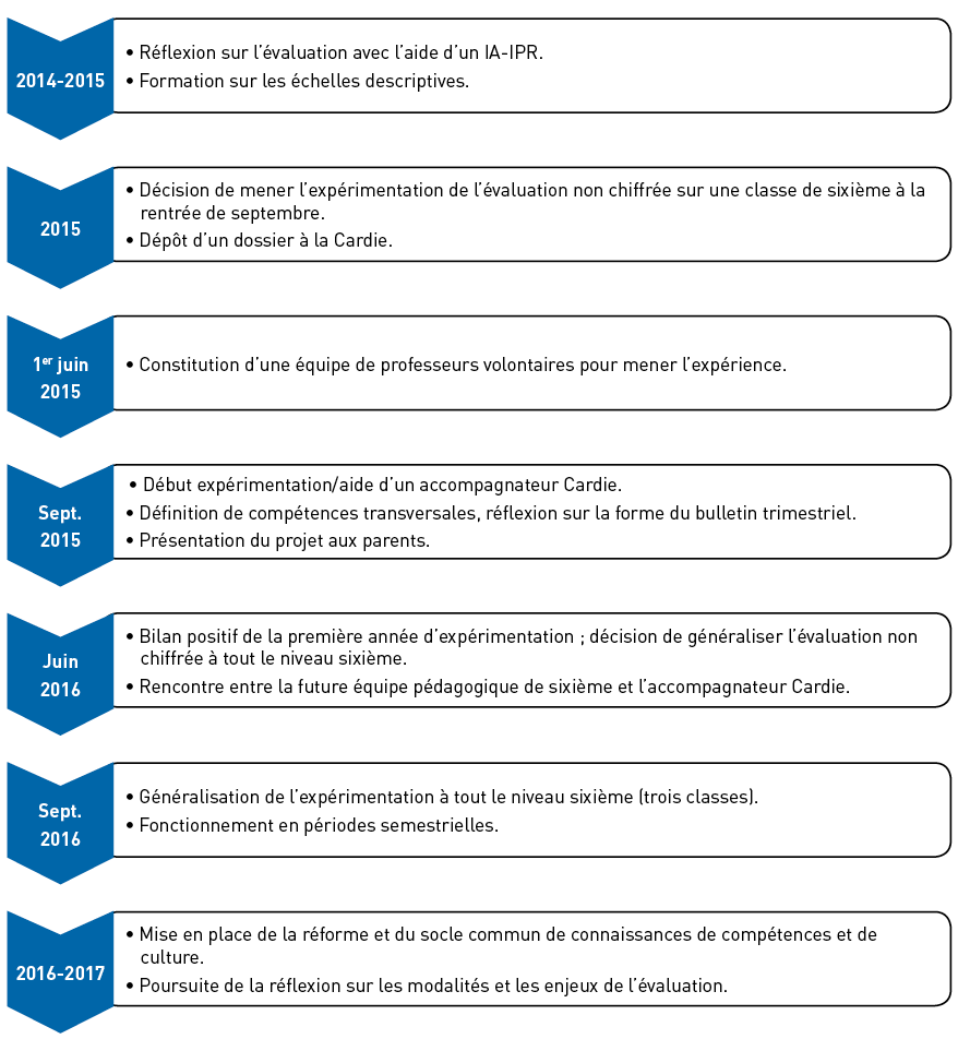 5) À la fin de cette année scolaire, le bilan est positif : les enseignants de la classe ne sont pas tous au même niveau d'expérimentation, (certains ayant déjà pratiqué l'évaluation non chiffrée l'année précédente), mais tous souhaitent poursuivre et faire évoluer leurs échelles descriptives. Avec l'appui de la direction et après concertation de l'ensemble des enseignants, il a été décidé d'étendre l'expérimentation aux trois classes de sixième.