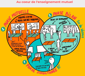 Le principe de la classe mutuelle définit par Vincent Faillet et les adaptations par les enseignants. Les séances sont ritualisées et calibrées en 3 phases pour permettre un maximum d'échanges entre les élèves. La durée optimale est de 1,5 h.