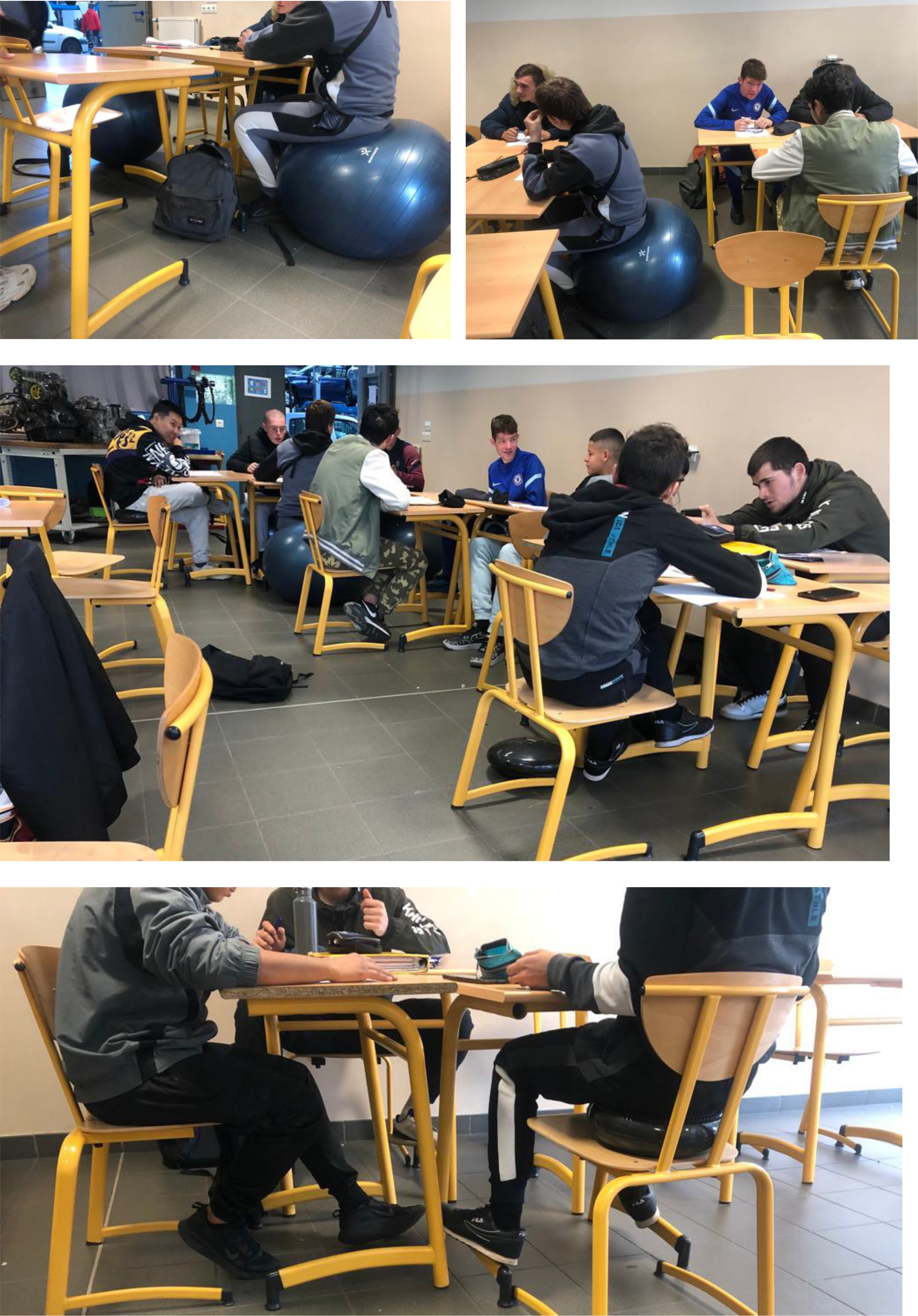 Le matériel a été présenté à la classe par tous les enseignants qui ont incité leurs élèves à les utiliser librement. Et les débuts sont encourageants : les élèves utilisent ballons et galettes avec entrain ; ils se déplacent spontanément pour utiliser le tableau, ils ont visiblement à cœur d’expérimenter une nouvelle posture en classe. Les enseignants constatent dès lors de premiers progrès dans l’attention. Ils ne jugent pas nécessaire de rédiger une charte d’utilisation car les élèves se répartissent sereinement le matériel et le rangent en fin de séance. Mais très vite la curiosité des élèves s’émousse et l’apport du matériel reste en-deçà des attentes des professeurs, au point que le matériel se trouve souvent remisé au fond de la salle, et de moins en moins utilisé.