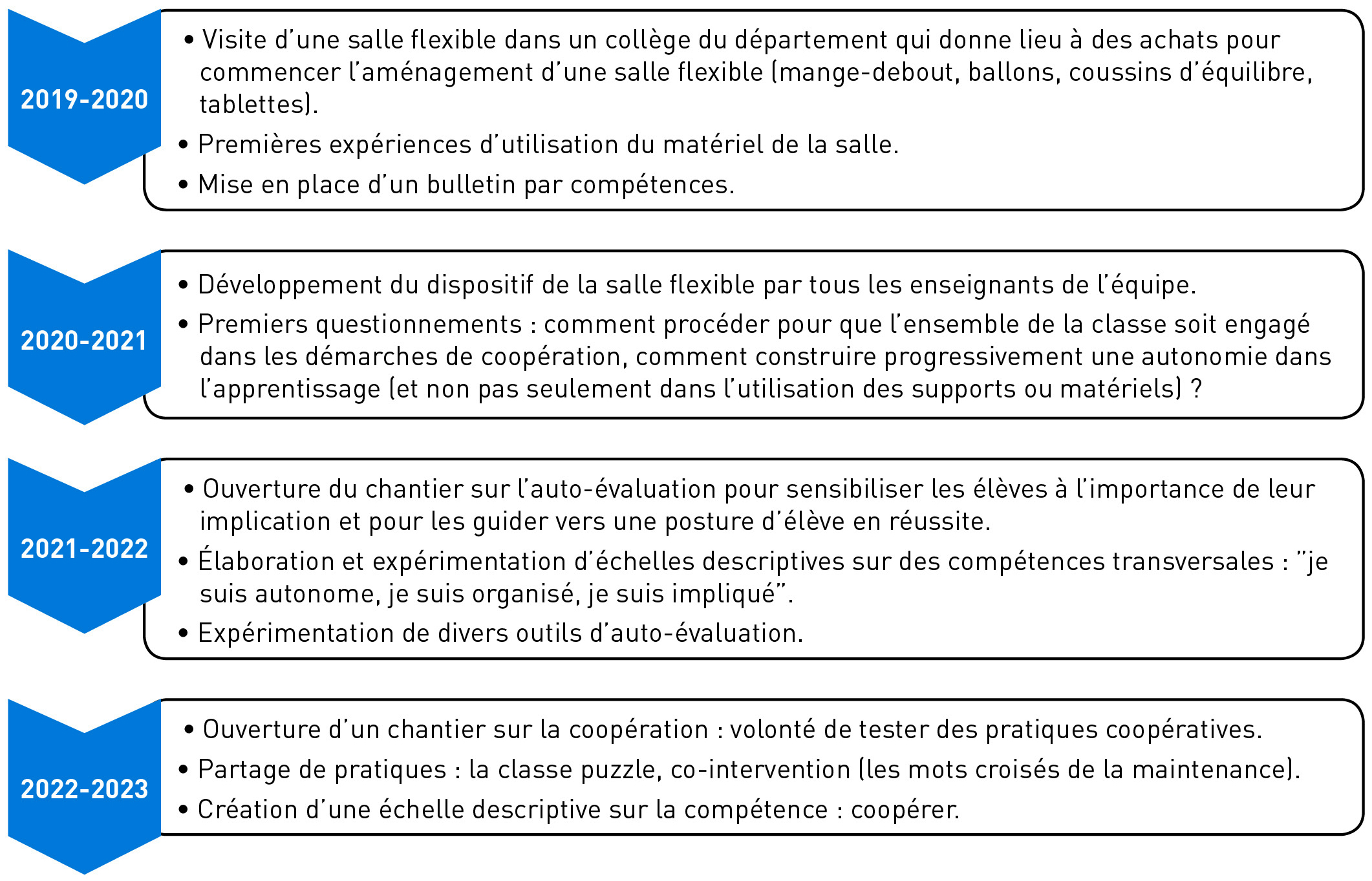 L’équipe s’est aussi attelée à une réflexion collective sur les pratiques de coopération en classe . La classe flexible trouve en effet son fondement dans la possibilité de pouvoir partager et mutualiser. Attachés à développer également la coopération entre professeurs, plusieurs enseignants ont partagé des activités menées en classe, comme diverses propositions de travaux de groupe, ou de classe puzzle. Ces expériences ont fait surgir le besoin de développer les compétences psycho-sociales des élèves, dont le mode de relation semble souvent se réduire à l’invective.