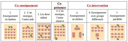 Dans tous les cas, les deux enseignantes sont impliquées simultanément, ce qui signifie qu’elles partagent aussi des temps de préparation et de bilan des séances, hors de la présence des élèves. Dans les quatre premières configurations, les deux enseignantes doivent partager le même espace afin de se voir et de s’entendre, ce qui n’est plus obligatoire dans les trois dernières configurations (5, 6, 7).