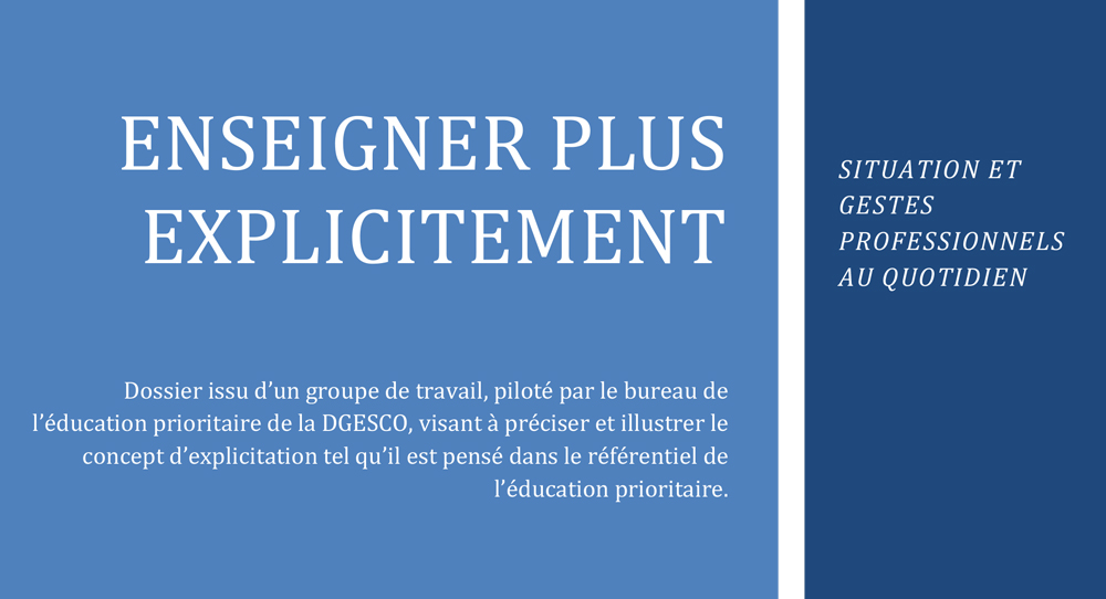 issu d’un groupe de travail, piloté par le bureau de l’éducation prioritaire de la Dgesco, visant à préciser et illustrer le concept d’explicitation tel qu’il est pensé dans le référentiel de l’éducation prioritaire.