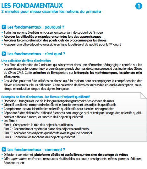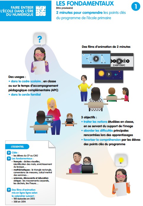 100 films d'animation en 2013 et 500 en 2014 à destination des élèves du CP au CM2 seront mis en ligne pour l'apprentissage de notions de base en français, mathématiques et sciences.