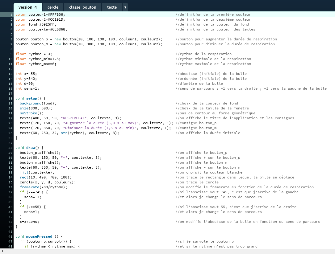 Vient ensuite, une appropriation progressive du logiciel Processing, les fonctions de contrôle. Processing a été choisi en partie par le fait qu'il permettait de mettre tous les élèves sur un pied d'égalité vis-à-vis du logiciel. Sur les séances suivantes, ils doivent améliorer leurs applications en "versionnant" au fur et à mesure. Ces versions sont documentées dans un fichier qui conservent la mémoire de ces améliorations.