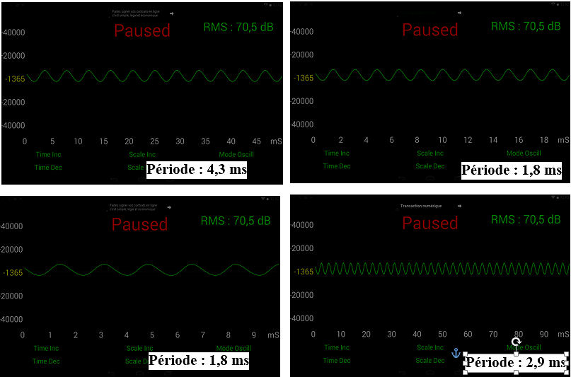 - Mauvaise application choisie que Sound Oscilloscope : la période devient différente si l'on modifie la graduation des axes (voir ci-contre). Cette anomalie importante n'est pourtant pas évoquée dans la notation visible pour toute application dans le Play Store sous Android. Il est donc nécessaire d'avoir un recul critique sur la qualité des applications mises à disposition. Pour autant, cette déficience n'a pas remis en question les capacités visées lors de la séance.