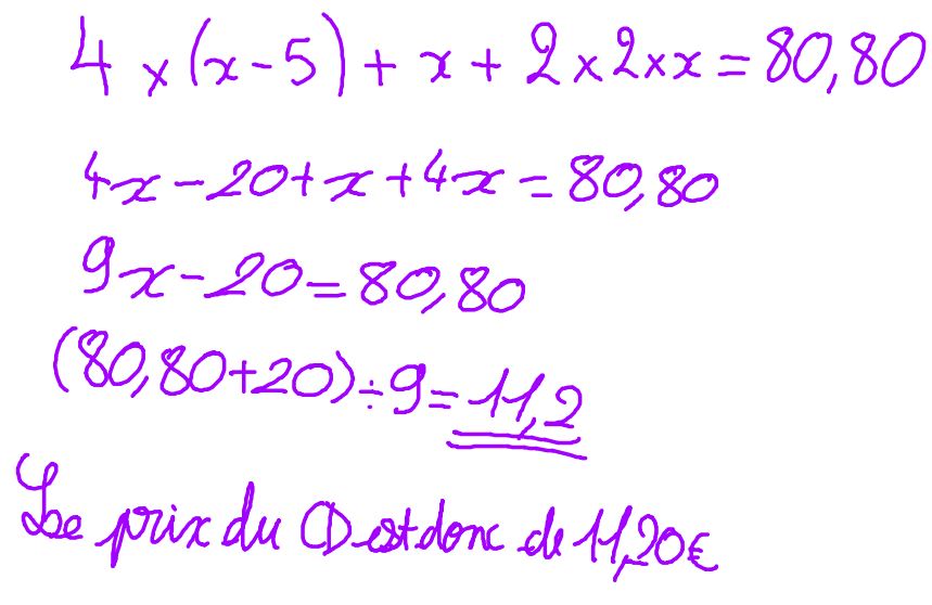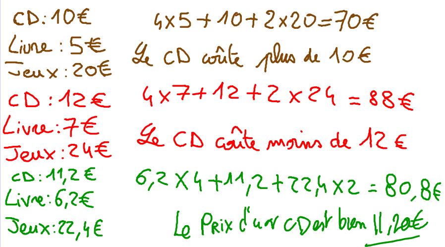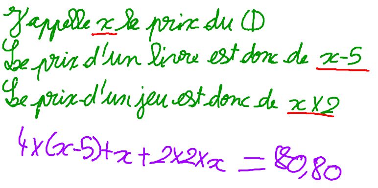Un livre coûte 5 € de moins qu’un CD et un jeu vidéo coûte le double d’un CD. Arthur achète 4 livres, 1 CD et 2 jeux pour un total de 80,80 €. Quel est le prix d’un CD ? D’un livre ? D’un jeu vidéo ?