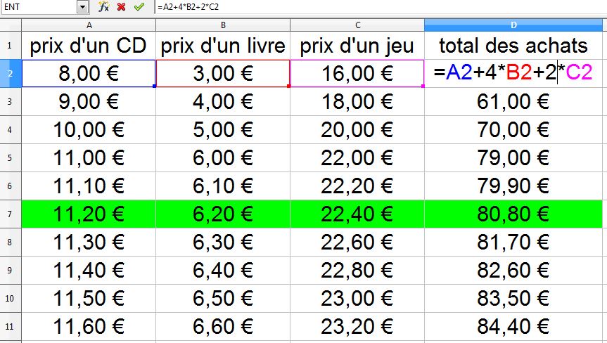 L’élève qui est capable de comprendre et utiliser la programmation des cellules (par exemple = A2+4*B2+2*C2), fait un pas vers l’algébrisation : x + 4y + 2z ….