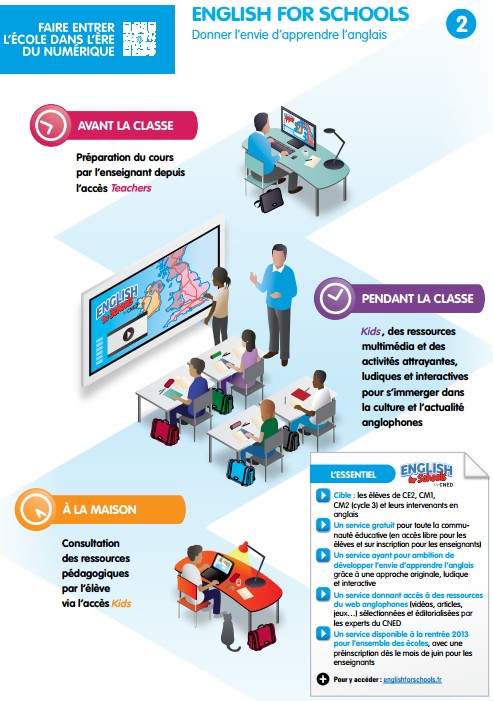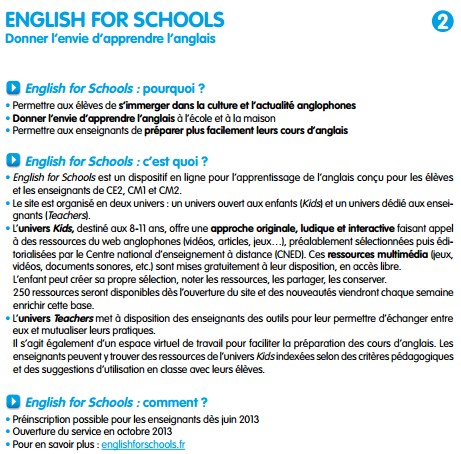 A partir d'octobre 2013 et dès le mois de juin pour les enseignants, le service en ligne Englishforschools pour les élèves du cycle 3 permet d'accéder à des ressources du web anglophones.