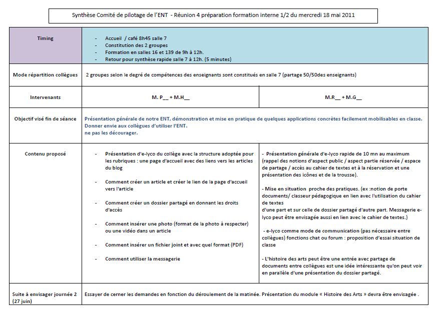 Proposition d'actions encadrées par les personnes-ressources : - deux journées de formation sur les fonctionnalités en direction de l'équipe éducative - enquête sur les pratiques et les besoins - ateliers sur les usages de l'ENT animés avec les élèves à l'occasion de la "semaine extraordinaire" (projet pédagogique pour les élèves qui restent dans l'établissement au moment où d'autres sont en séjour à l'étranger avec leurs professeurs) en mars : expérimentation de scénarios pédagogiques avec les élèves (utilisations de la messagerie, des agendas, des porte-documents, de salles de chat, dans des situations pédagogiques, récupération de sites d'intérêt pédagogique dans les favoris (classes de 5è et 4è), alimentation de rubriques liées aux séjours par les blogs). Nouvelles propositions après sondage et analyse des besoins : alternance de formations « à la demande » et programmées (reconductibles) : deux demi-journées en juin avec deux groupes de niveau : | (cliquer sur l'image pour accéder au document) |
