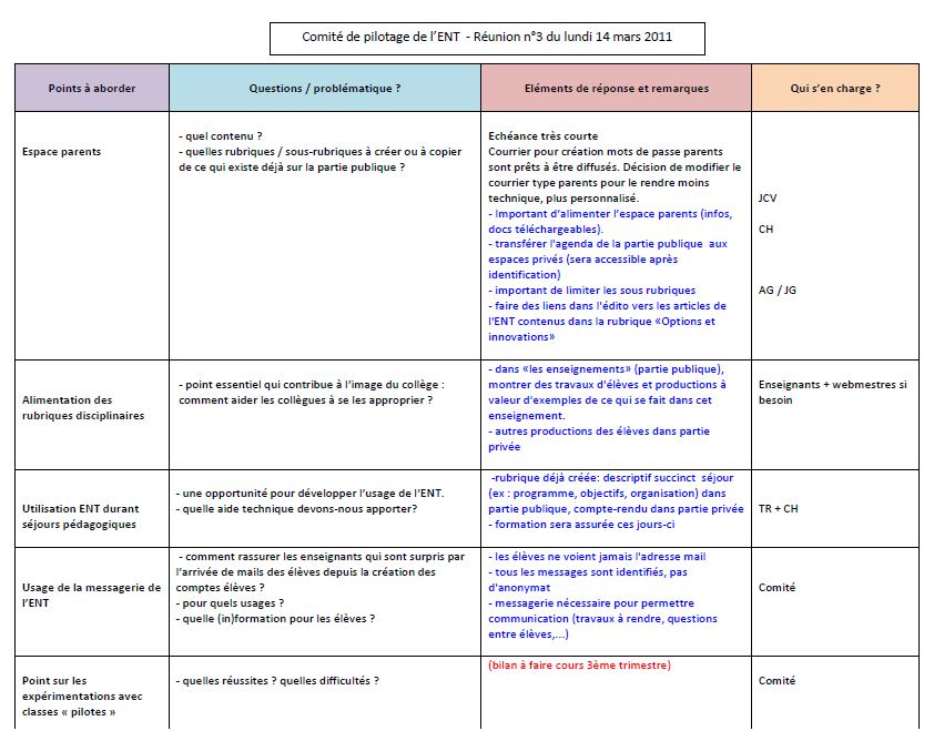 8/11 : 1ère réunion : - définition des rôles de chacun - décision de basculer de l'ancien site web vers le portail e-lyco au 01/01. 3/12 : réflexion sur les applications à déployer, selon quel rythme - répartition des tâches entre membres du comité - choix de classes-pilotes avant d'étendre aux autres classes 10/01 : retour d'enquête sur les usages en salle informatique - décision de développer les dossiers partagés - bilan positif de l'expérimentation conduite avec 2 classes - gestion du problème de récupération des mots de passe perdus 14/03 : multiples tâches : - travail sur l'espace parents - alimentation des rubriques - séjours pédagogiques de la semaine extraordinaire - argumentaire pour rassurer les équipes sur la messagerie en conseil pédagogique 15/03 : point sur le travail du comité et les perspectives en conseil pédagogique 19/04 : réunion expérimentation HDA 17/05 : organisation et contenu des 2 demi-journées de formations internes des 18 mai et 17 juin 19/05 : comité de pilotage ENT / HDA fin juin : bilan et rapport annuel | (cliquer sur l'image pour accéder au document) |
