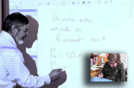Nous avons alors eu l'idée d'associer à la classe virtuelle, dans la classe un tableau blanc interactif et au domicile de l'élève, un Tablet PC.