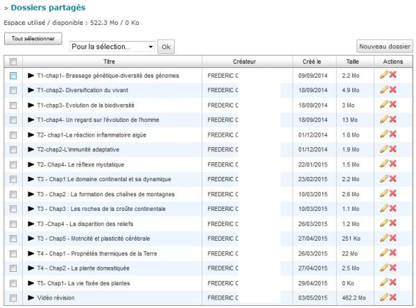Dans cet exemple, le dossier "classe" propose aux élèves des documents de soutien et de prolongement dans chaque chapitre du programme de TS
