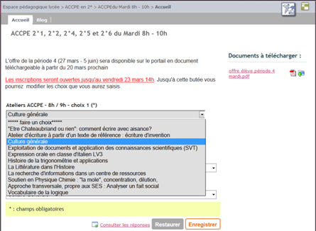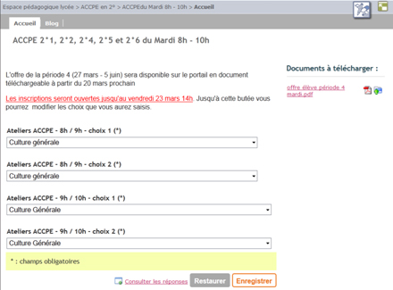 Avant chaque période, les enseignants concernés rédigent dans l'ENT une offre d'atelier.