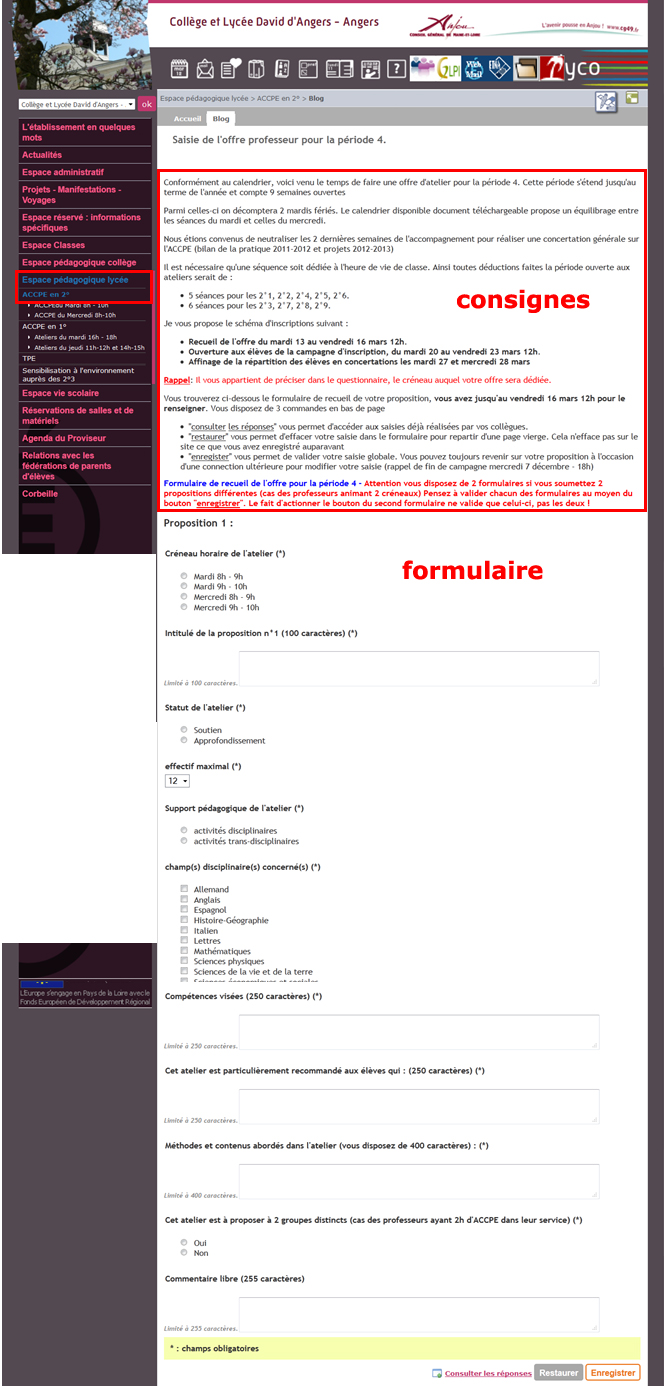 15 jours en amont de la période, les enseignants concernés par une intervention en ACCPE sont appelés à rédiger une offre d'atelier. Le recueil de cette offre s'opère via un formulaire mis en ligne dans la rubrique dédiée sur le portail e-lyco de l'établissement, pour l'instant accessible aux enseignants uniquement.