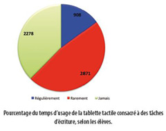 Il apparait ainsi que la consultation des manuels numériques est l'usage majoritaire avant la recherche internet et que la réalisation de projets d'écriture avec la tablette est très rare. La tablette serait donc davantage un outil de consultation qu'un outil de production.