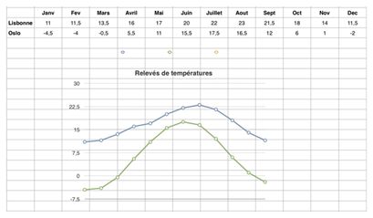 - Représenter graphiquement les données : Á titre d'exemple, lors d'une étude climatologique, les élèves peuvent inscrire les valeurs relevées de villes données, à partir d'une application météo en ligne et réaliser ensuite le graphique correspondant.
