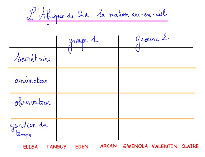 • enfin, pour les groupes composés de 4 élèves, un élève sera "gardien du temps", afin que le groupe puisse rendre son travail dans le temps imparti.