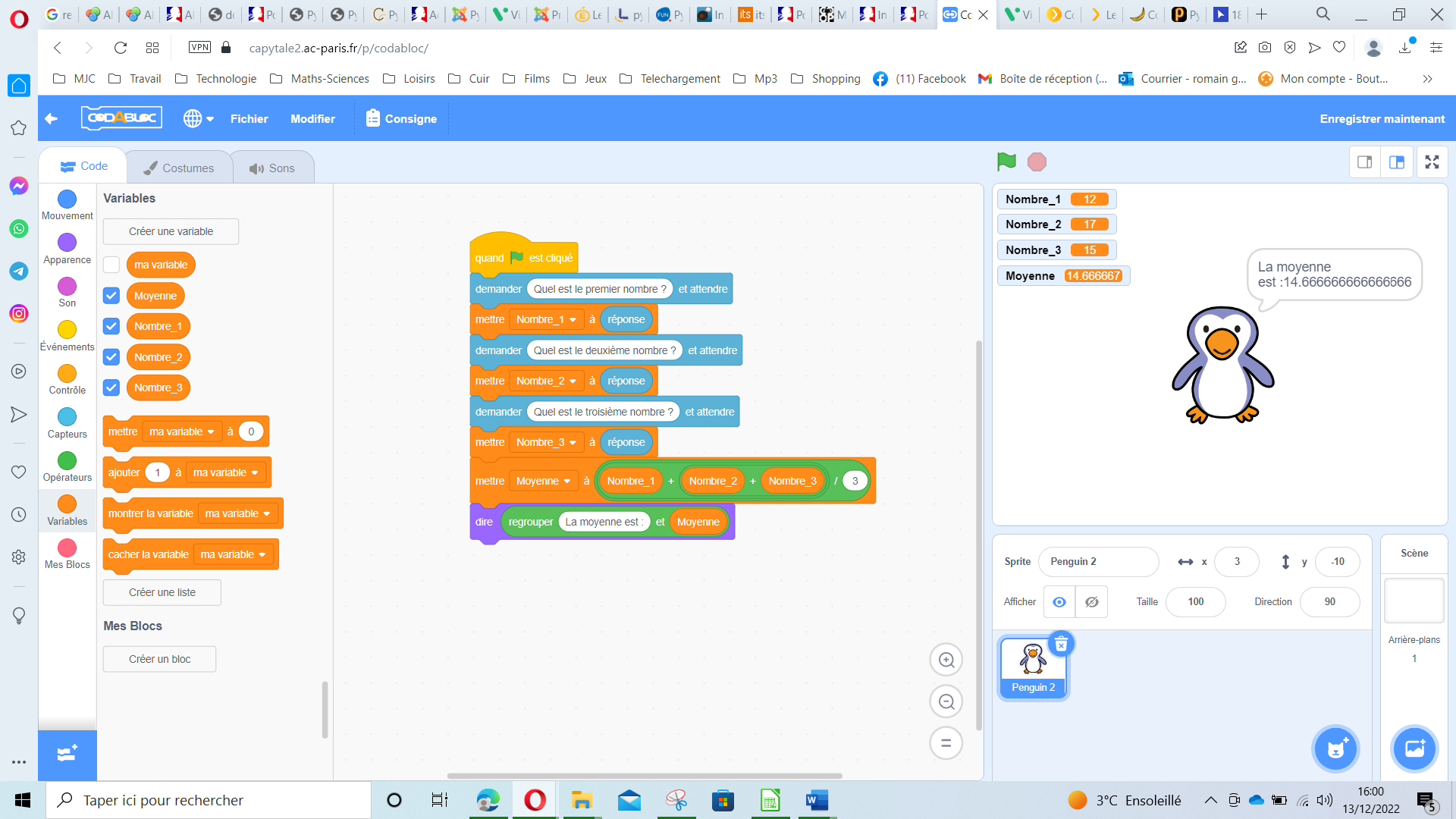 Réaliser, avec Scratch, à partir de l'analyse précédente, un programme permettant de calcul d'une moyenne de 3 nombres.