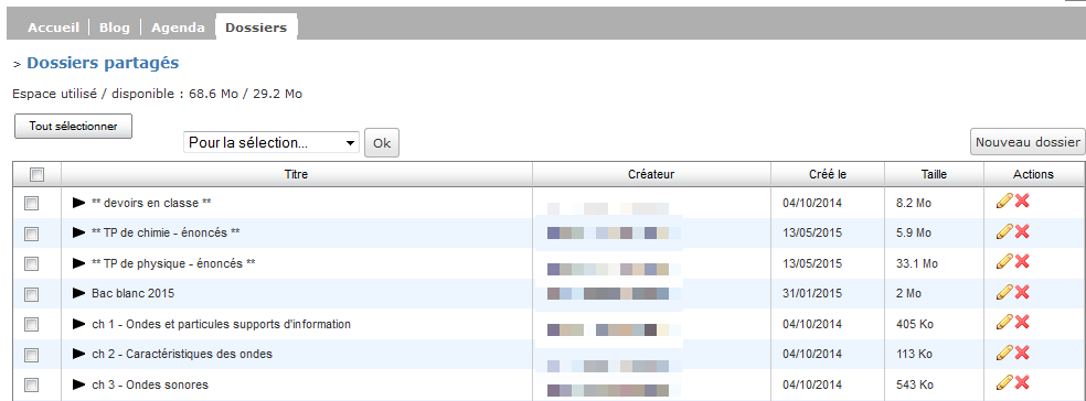 Les dossiers d'une sous-rubrique de classe (e-lyco)
