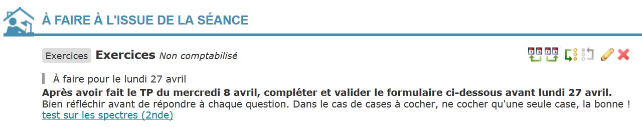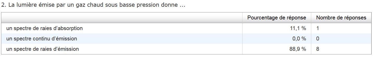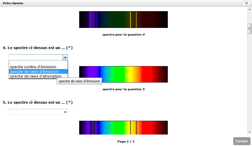 L'exemple ci-dessous est un extrait de QCM sur les spectres, proposé en fin de séance de TP en classe de seconde, pour tester ce qui a été retenu et compris :