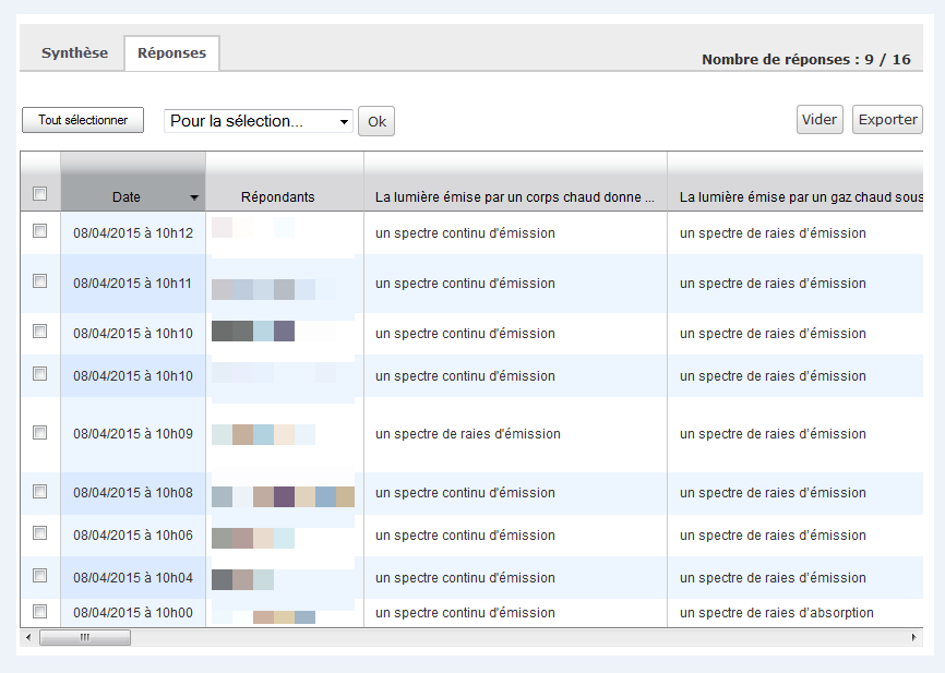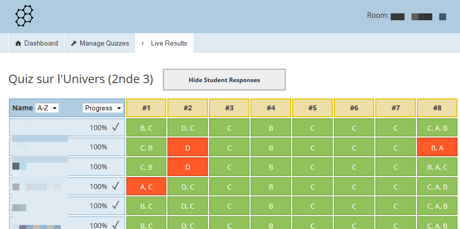 On peut suivre les réponses d’élèves pour chaque question :