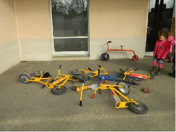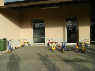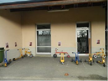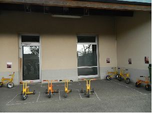 Entre les trois moments où les élèves utilisent la cour de récréation, les objets roulants restent dans la cour. En cas de pluie, ils sont tout mouillés et donc inutilisables. De plus, celle-ci les abîme et prive les élèves de certains lorsqu'il faut les réparer. |