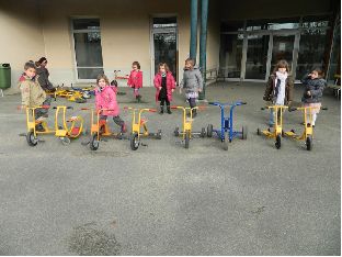 Par groupe de 15, en début d'après-midi et en décloisonnement avec une maîtresse de petite section tous les élèves de grande section de l'école ont participé à ce projet. Puis les agents techniques de la Mairie interviendront pour finaliser le projet : - accrochage des photos des objets roulants - peinture au sol pour les places de parking des objets roulants sous les préaux - peinture au sol pour le tracé des parcours - fixation des panneaux de signalisation |