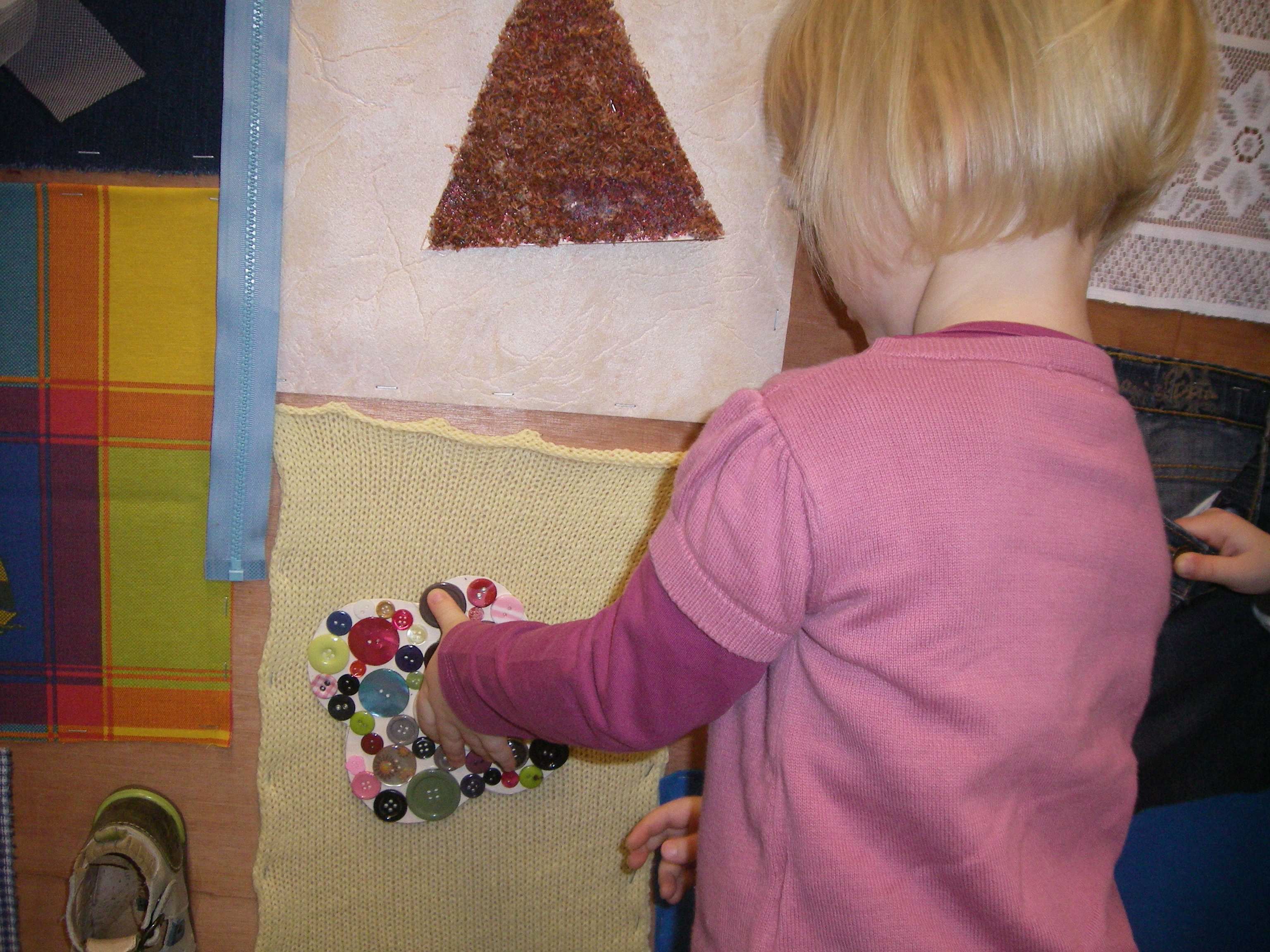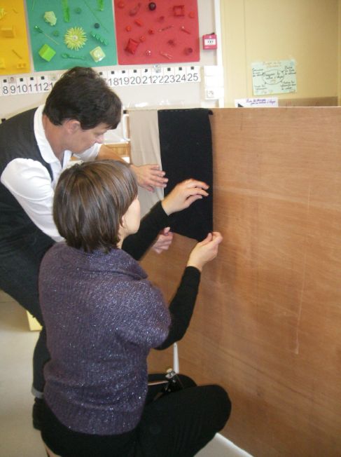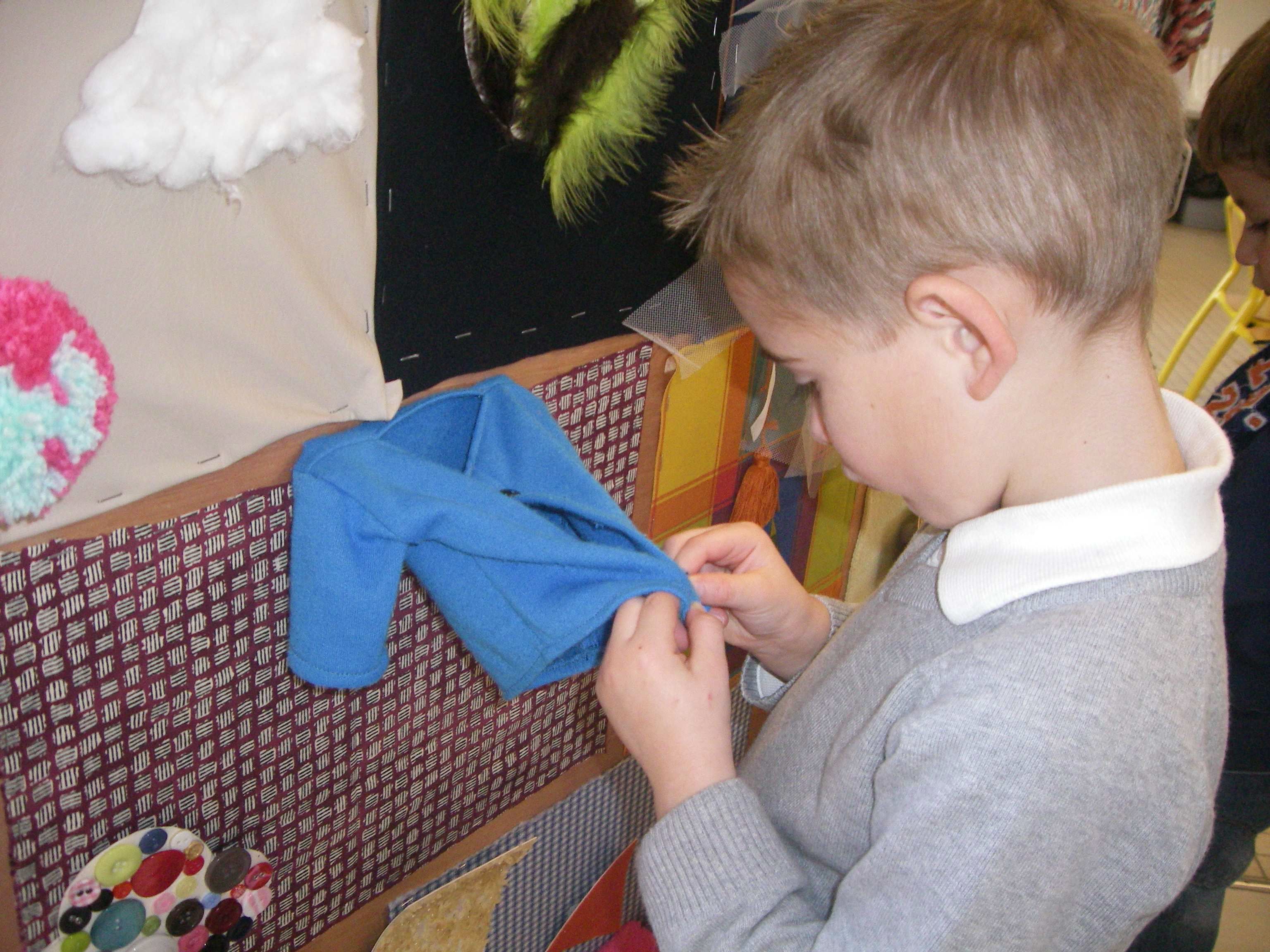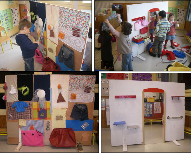 Coin déguisement : - Nous ajouterons quelques photos sur le panneau de personnes costumées, - La possibilité de pouvoir ajouter, remplacer des déguisements et accessoires au gré des envies, de nouveaux projets, de changement de classe permet de conserver son attrait et son intérêt. Exemple : pour cette période 3, nous allons travailler à partir de l'album « Les trois petits cochons ». Nous allons fabriquer les masques et les queues du loup et des cochons pour les intégrer dans la malle de déguisements. Les élèves pourront ainsi jouer cette histoire. Coin panneau de manipulation, sensoriel... : - Les différentes formes géométriques (un de nos projets de la période 2) que nous avons réalisées avec divers matériaux se fixent au panneau à l'aide de velcro. D'autres réalisations, avec le même système de fixation peuvent s'ajouter, remplacer. - Installer par exemple une bande aimantée tout le long du haut du panneau peut permettre de réaliser des frises (exemples : alphabet avec diverses matières, algorithmes...). |