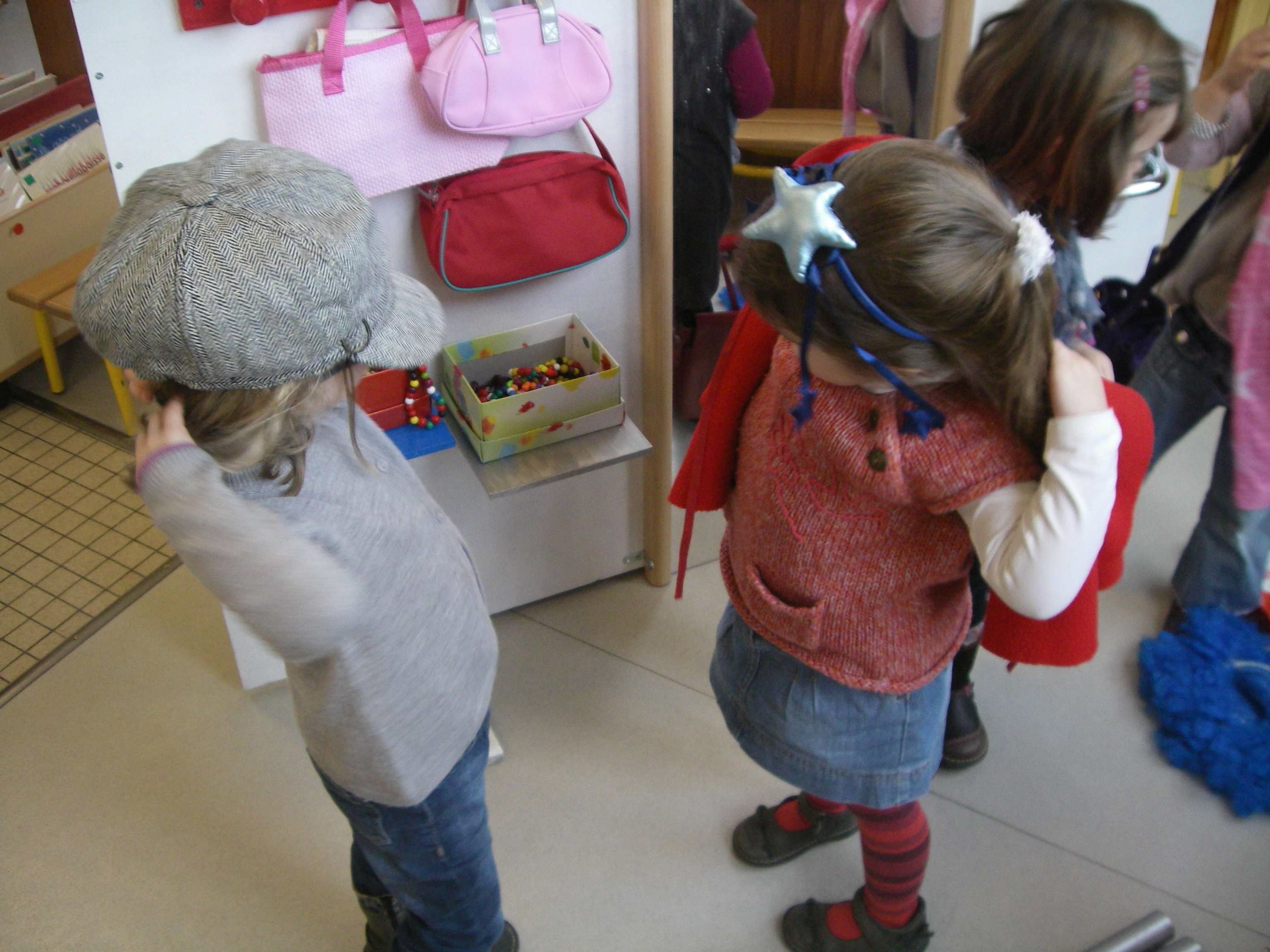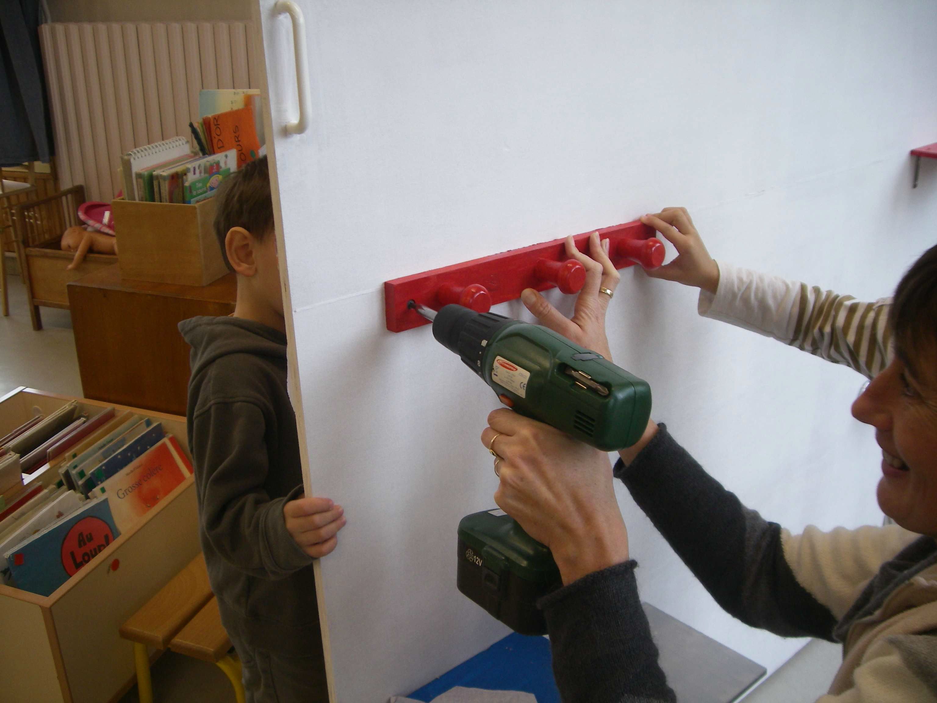 Depuis longtemps, l'idée d'un coin manipulation germait mais en cherchant un endroit sur un mur pour faire un panneau. La place était difficile à trouver. Lors des lectures diverses des documents mis en ligne à l'occasion des 24 h de la maternelle, le coin déguisement était lui aussi très attirant. Pendant les vacances de la Toussaint, à force de réflexion, de divers croquis, l'idée du coin recto verso est née : deux coins jeux en même temps, mobiles et donc transportables dans toutes les classes, évolutifs dans le temps et suivant les élèves utilisateurs. Un mot était mis dans les cahiers de liaison dès le retour des vacances pour expliquer l'action « 24h de la maternelle » et le défi « aménager un coin jeu ». Un croquis et une liste de nos besoins étaient joints pour récolter tout le matériel nécessaire à la réalisation du coin jeu. |