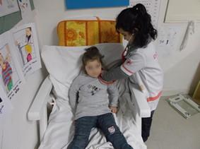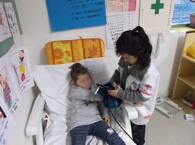 La patiente (TPS) lève le bras pour que le « docteur » (MS) lui prenne la tension. |