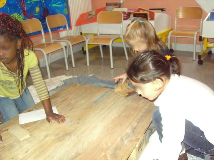 Pour éviter les problèmes d'échardes, les élèves ont commencé à poncer la palette. Ce travail était assez long et fastidieux ! Nous avons donc eu besoin de plusieurs « ponceurs » ! Nous avons profité de cette activité pour apprendre du vocabulaire (cale à poncer, poncer, papier de verre...) |