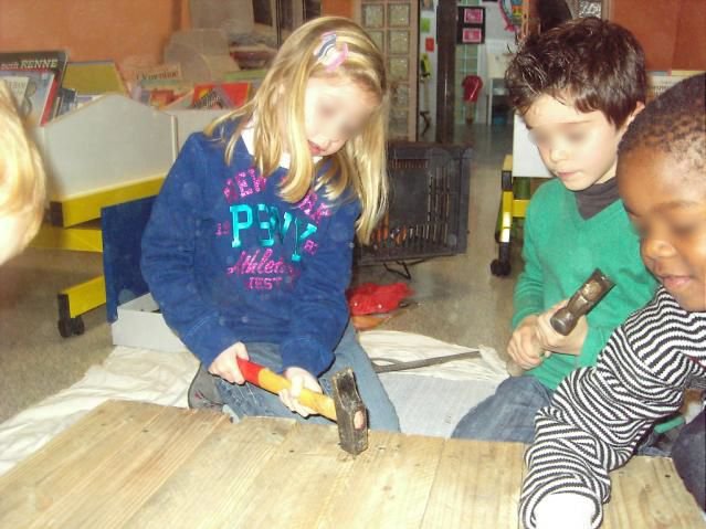Pour bien fixer les planches de la palette, nous avons rajouté quelques clous. Avant de commencer, nous avons rappelé quelques règles de sécurité. L'adulte n'était pas loin ! Ici aussi, nous avons appris du vocabulaire (clouer, clous, pointes, maillet, marteau...) |