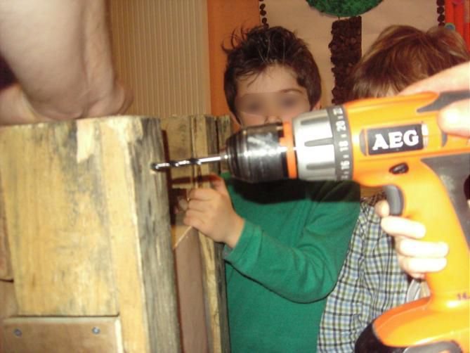 Le papa de Mathilde perce des trous à l'aide de la perceuse pour fixer des roulettes sur la palette. Vocabulaire appris : perceuse, percer, mèche... |